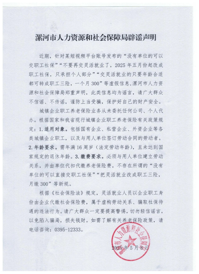 经向漯河市人力资源和社会保障局核实,以上内容均为虚假不实信息。请广大市民按照政策规定的要求和渠道办理社保手续,谨防上当受骗、损失钱财。