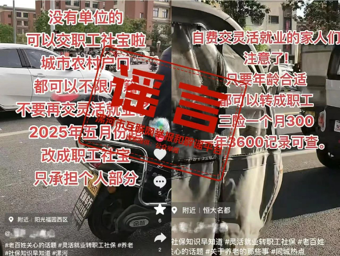 近日,河南省漯河市网信办接网民举报,某短视频平台账号编造传播“没有单位的可以交职工社保”“不要再交灵活就业了,2025年五月份起改成职工社保,只承担个人部分”“交灵活就业的只要年龄合适都可转成职工三险,一个月300”等信息,引发网民关注。